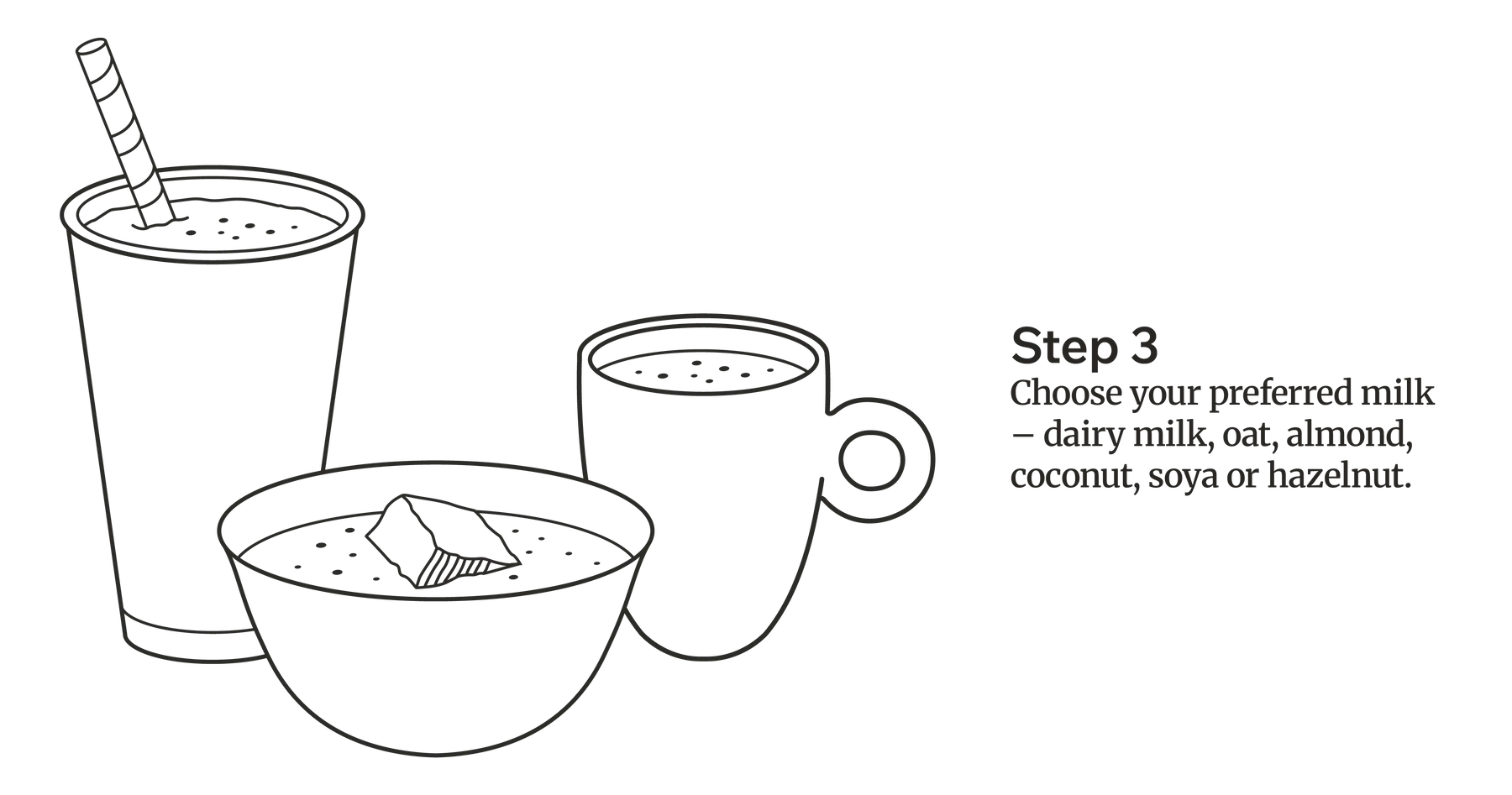We make our drinks with whole milk, but we also offer semi-skimmed, skimmed and lacto-free.