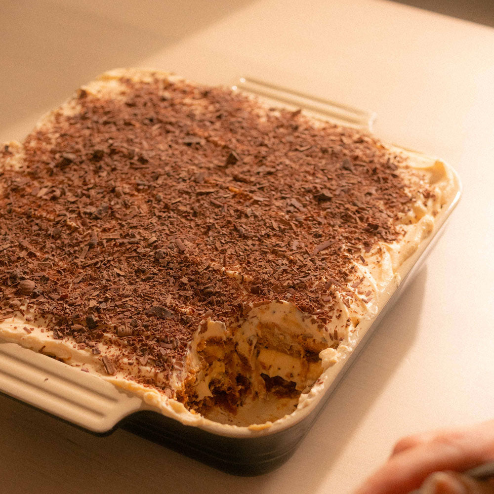- Add a thin layer of the mascarpone mixture and chocolate flakes into the bottom of a dish, then a layer of sponge fingers that have been briefly dipped into the coffee mixture. Repeat these layers, then finish with a final layer of mascarpone cream and chocolate flakes on top.